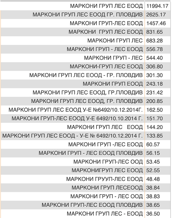 ارائه شده است دارنده رکورد Marconi Group Les OOD فقط 100 BGN سرمایه دارد و متعلق به پنکا بانگیوا است. مالک سابق اوگنی شیشکوف از دوین است. در سال 2018 ، اوگنی شیشکوف شرکت Tika Trade را از Tencho Koychev Dimov ، که مدیر شرکت Multifruit است ، خریداری کرد. این یک شرکت از Multigroup سابق است ، که روابط گرم آن با MRF اطلاعات عمومی خوبی دارد.
