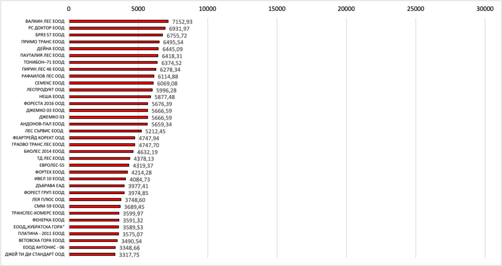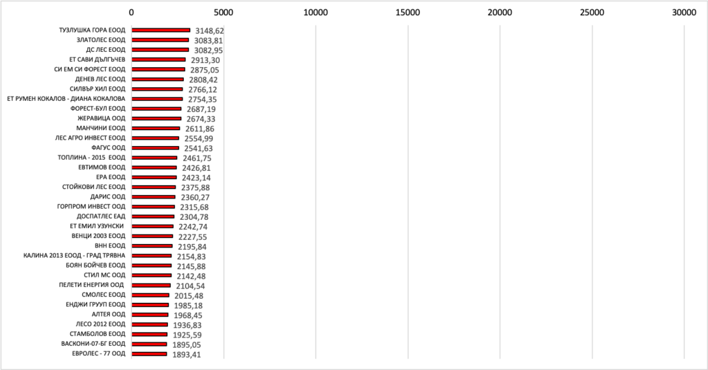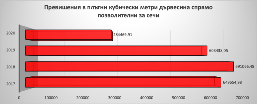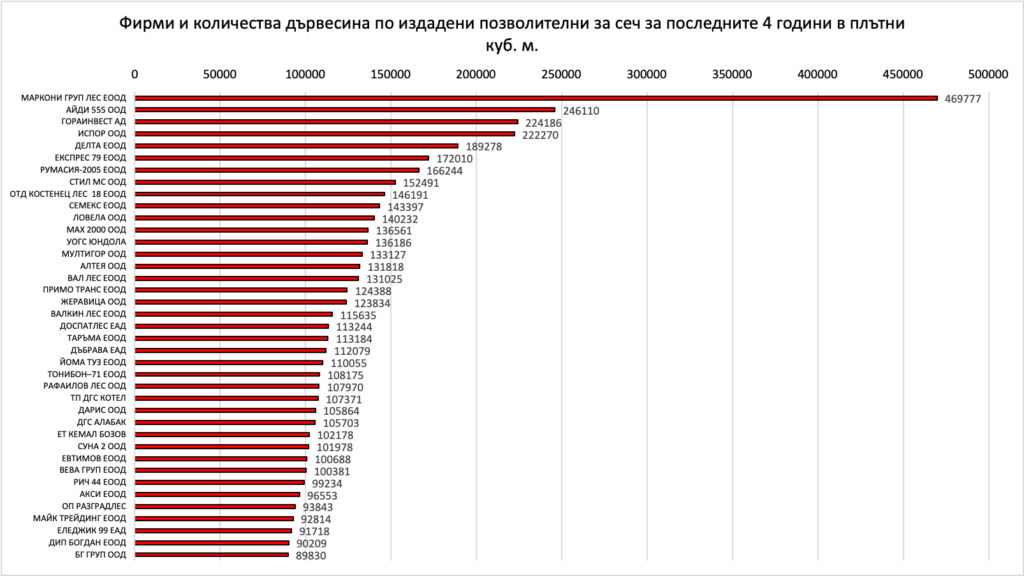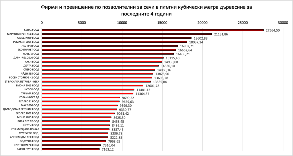 اضافی از بیش از 1000 متر مکعب بیش از 200 شرکت سالانه چوب برای مجوزهای قطع دارند. در میان آنها 20-30 شركت متمایز هستند كه بیش از چندین بار بیش از حد شده و مقادیر چوب برداشت كرده اند ، به طور قابل توجهی بیش از حد مجاز مجوز قطع ، و به احتمال زیاد همان تعداد ، اما كاملاً غیرقانونی. برای برخی از آنها ، ارتباط با برخی از احزاب پارلمانی واضح است ، که این سisesال را به وجود می آورد که آیا هیچ محافظتی و چتری از طرف دولت وجود ندارد.
