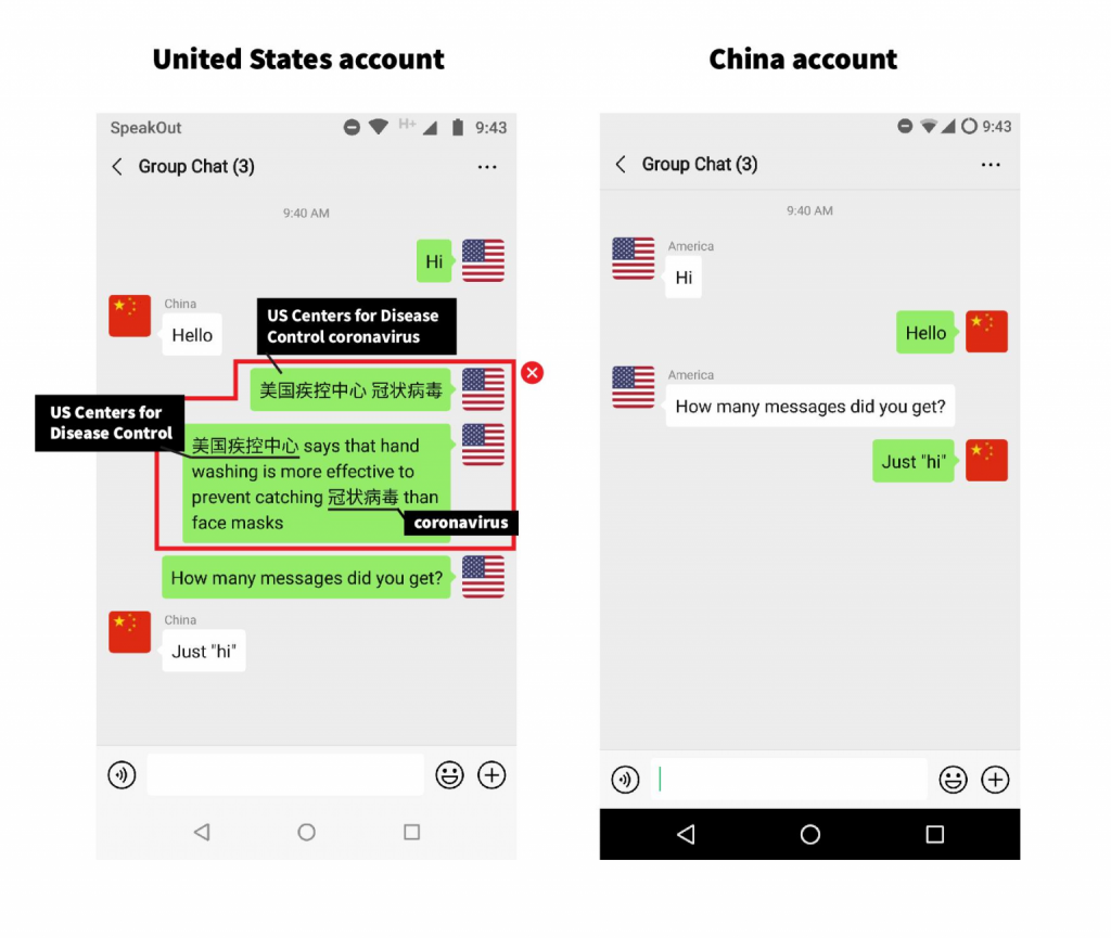 Tencent ادعا می کند که آنها سانسور یا نظارت بر ارتباطات از طریق WeChat را تسهیل نمی کنند. این امکان وجود ندارد که Tencent واقعیت را بیان کند ، بر اساس این واقعیت که آنها مجاز به فعالیت در چین هستند و محققان بارها ثابت کرده اند که پیام های WeChat از جمله محتوایی که دولت ممکن است قابل اعتراض بداند هرگز مجاز نیستند از طریق برنامه منتقل شوند . علی رغم ادعاهای آنها ، آزمایش ساده و عملکرد آنها مطابق با قانون چین ادعای آنها را به طور خودکار رد می کند. The Citizen Lab University of Toronto بخش قابل توجهی از منابع تحقیقاتی خود را به حفظ حریم خصوصی آنلاین اختصاص می دهد. Citizen Lab آزمایشی را کشف کرد که سانسور همه گیر را از طریق WeChat کشف کرد. کلمات و عبارات مربوط به لی ونلیانگ ، پزشک افشاگری که بدون تصویب دولت از شهروندان در مورد COVID19 مطلع شد ، بلافاصله سانسور شدند. اکثر کلمات و عبارات مربوط به COVID19 ، از جمله کلمات کلیدی مربوط به اعلان دولت چین به دولت آمریکا در مورد ویروس هفته ها قبل از اینکه حتی به شهروندان خود بگویند ، نیز مسدود شده بودند.